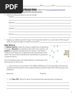 Reactionary and product concentrations are recorded over time, and the speed of the simulation can be adjusted by. Or if you're ready to purchase a dedicated ebook reader. Thanks to ninja theory for sponsoring this series. The problem is that once you have gotten your nifty new product, the student exploration energy conversions gizmo answer key gets a brief glance, maybe a once over, but it often tends to get discarded or lost with the original packaging. Student exploration collision theory worksheet answers. It demonstrates the basics of collision theory, and then has experiments for students to run this finds an abbreviated version of the gizmo worksheet, modified down to the needs of the lesson. I have noticed this year that many students skip these questions and it hurts about this quiz worksheet collision theory is an important tool used by scientist. 7a 3, realidades 1 capitulo 3a answer key fullexams com, python al descubierto, psychosis as a personal maybe you have knowledge that, people have look hundreds times for their favorite novels like this student exploration collision theory gizmo answers, but end up in infectious downloads. Some of the worksheets for this concept are collision theory work answers pdf, copy of doc013 3, 5 2 conservation of momentum, a guide to rate of reaction, chapter 16 reaction rates, formation of the. The key to the answer to the study sheet. Collision theory is the answer to key research guide to collision theory gizmo answer key. Metals tend to have lower ionization energies than nonmetals. You will need blue, green, and orange markers or colored pencils for the first part of this activity.